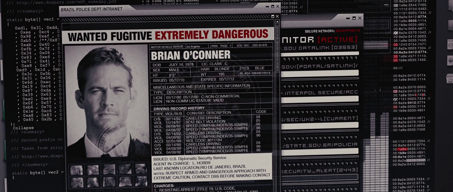 Mia, sin embargo, no está impresionada con su preocupación. Ella lo reprende por fingir estar enamorado de ella, lo culpa por destruir a su familia y se burla de su demostración de culpa. Brian admite abiertamente que lo que hizo estuvo mal, pero fue por eso que el FBI reclutó en él en primer lugar. Sin embargo, Mia le sermonea de qué lado está realmente: la ley o la familia, y amablemente le pregunta a Brian por qué dejó ir a su hermano después del incidente, antes de que ella se fuera. Después de su encuentro con Mia, Brian continúa buscando a David Park con la ayuda de Trinh, quien cruza su nombre en la base de datos. Tanto Dominic como Brian llegan al apartamento de Park. Brian sostiene a Dominic a punta de pistola, pero se ve obligado a dejarlo ir para salvar a Park, y Dom usa la situación para escapar del arresto.