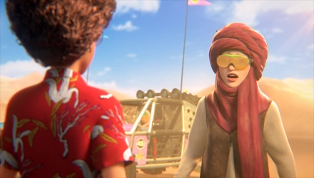 The group hid behind their dune buggies. Tony recognized Rafaela behind the wheel. Cisco mentioned Matsuo had a laser cannon arm, which they were shot at with. Echo recognized Matsuo, and told the group that they were on the right trail to Cleve. Echo told Frostee to time the intervals that facilities exploded so they could find Cleve. They followed the explosions while being chased by Matsuo and Rafaela.